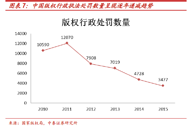 长久以来,中国版权市场盗版现象较为严重,屡禁不止,源于其庞大的市场基础。 (1)从市场环境来看,相关政策及法律不健全; (2)从商品特性方面来看,盗版与正版互为替代品,且盗版成本远远低于正版,价格优势更为明显; (3)从需求方来看,中国长期以来追求粗放式的增长,创新相对来说不被重视,民众版权意识相对薄弱,在选择购买盗版和正版时以价格为唯一因素进行考量; (4)从供给方来看,盗版成本较低,且法律保护长期滞后,监管机制不够严密,使得大量盗版供应商进入该市场,与此同时,版权所有者维权成本较高。 . 随着技术进步、消费升级、相关政策及法律不断完善,版权市场环境不断改善,中国版权市场迎来迅猛发展。