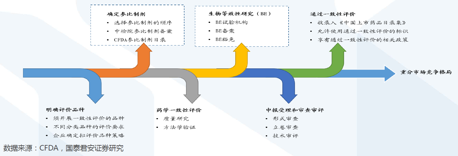评价流程:确定参比制剂与开展BE试验是两大关键。开展仿制药质量和疗效一致性评价工作,要求已经批准上市的仿制药品, 在质量和疗效上与原研药品能够一致,临床上与原研药品可以相互替代。