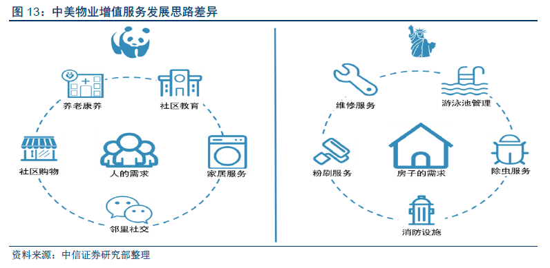 市场整体规模和发展阶段不同。尽管美国和中国的经济整体规模相似,但美国的家庭户数少于中国,存量房屋的套数少于中国。物业管理从根本上和经济体的住宅数量有关。中国的存量住宅规模远大于北美,且物业管理服务呈现较难跨国扩张的特点,中国的物业管理公司发展天花板比美国企业更高。而且,中国现阶段的基础服务收费水平也比较低(相对中国的租金和房价),长期来看,物业基础服务收费也有上升空间。