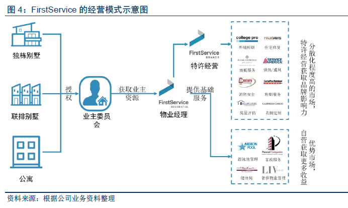 FirstService 的模式是物业经营与基础服务并重,其通过两大平台服务客户。分别是住宅平台FirstService Residential,是北美最大的住宅物业管理经理人;品牌平台FirstServiceBrands,是北美最大的基础服务供应商之一,其通过特许经营系统为住宅和商业地产提供服务。FirstService 通过两大品牌系统紧密分工,是北美平台型综合物业服务提供商的代表。