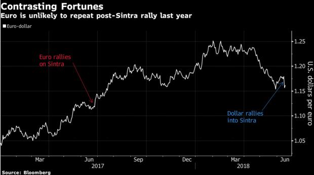 值得一提的是,在去年6月,同样的“辛特拉之役”曾一度推动欧元(1.1586, 0.0001, 0.01%)暴涨,然而市场普遍预计,今年的情况料将截然相反!据悉,德拉基去年6月27日在辛特拉欧洲央行论坛的演讲中,提出了欧洲央行调整大规模刺激政策的前景,促使投资者消化央行在9月宣布缩减刺激的可能性,欧元和国债收益率均出现短线飙升,这甚至一举奠定了欧元去年下半年发力上攻的基调!