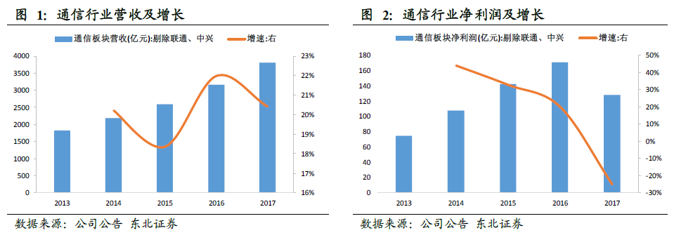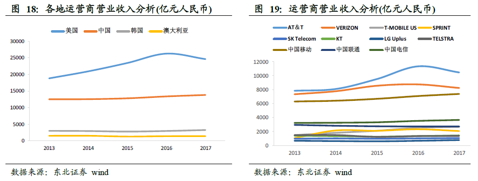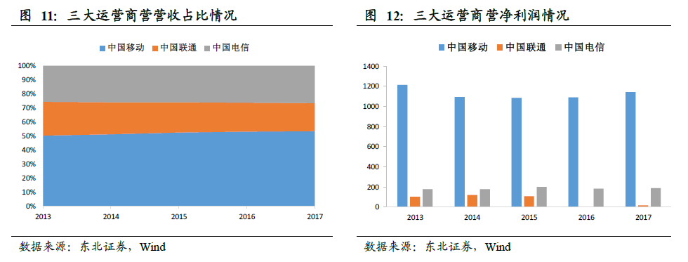 国内三大运营商营收和净利润保持同比增长,中国移动占据明显优势,中国联通业绩有所改善。2017 年国内三大运营商总营业收入维持增长,合计达到13815.72亿元,增速达到3.40%,其中中国移动、中国联通、中国电信的营收增速分别为4.35%、0.23%、3.96%;中国移动、中国联通、中国电信的营收分别为7405.14、2735.46、3662.29 亿元,占比分别为54%、20%、26%。2017 年国内三大运营商净利润合计1345.80 亿元,增速为5.78%,其中中国移动、中国联通、中国电信的净利润分别为1142.79、16.84、186.17 亿元,增速分别为5.09%、250.89%、3.40%,中国联通营业情况明显好转。
