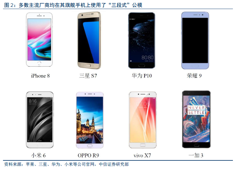 智能手机领域电容式指纹快速渗透,非全面屏时代“三段式”方案成为共同选择。自2013 年iPhone5s 首次搭载指纹识别以后,带有指纹识别功能的Home 键模块以其价格低廉、使用便捷、解锁迅速等优异性能迅速占领市场, 截止2017 年,全球智能手机市场指纹方案的渗透率达到55%,除指纹方案外,面部识别和虹膜识别作为补充方案,也被部份智能手机占比搭载,但占比相对较小。过去,指纹方案的布局方式主要有两种,一种是与Home键相结合的正面式指纹方案,另一种则是背部指纹方案,由于背部方案便捷性不足且容易破坏手机的整体性,因此在全面屏时代到来之前,前置方案逐步成为主流,根据第一手机研究院的数据,从2016 年初到2017 年初,国内市场畅销手机TOP20 中,搭载前置指纹识别的机型由5 款提升至9 款,后置指纹机型则维持7 款不变,在主要厂商的旗舰机型上,由“听筒/前置摄像头+屏幕+指纹”构成的三段式公模方案一度成为绝大多数手机的共同选择。
