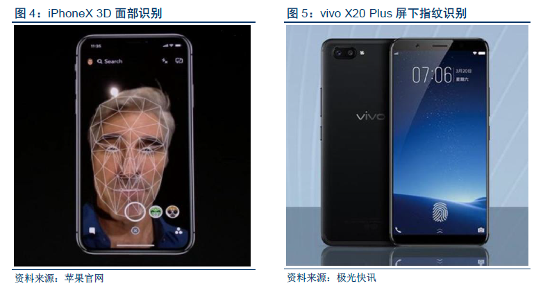 “全面屏”时代,经典设计遭遇挑战,屏下指纹、3D 面部识别、背部指纹成为现阶段3 种主要备选方案。尽管“三段式”公模曾一度成就了无数经典,然而全面屏的到来,却让这种“公模”彻底瓦解。从小米MIX 开始,三星S8、iPhone X、vivo X20、OPPO R11、魅族S6 以及华为P20 等纷纷追求最大化屏占比,而在此目标下,前置镜头、听筒、光线传感器、指纹键乃至品牌logo 等元素都面临缩小或者从手机正面移除的要求,其中首当其冲的便是指纹识别模块。为应对全面屏需求,目前市场上主流的解决方案有三种,分别是以vivoX20 Plus 为代表的光学式屏下指纹解锁方案,以iPhone X 为代表的3D 结构光方案和以三星、小米、OV 等为代表的后置指纹方案。