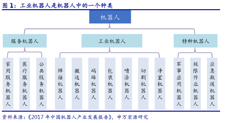 工业机器人种类众多,主要存在三大分类标准。工业机器人是面向工业领域的多关节机械手或多自由度的机器装置,它能自动执行工作,是靠自身动力和控制能力来实现各种功能的一种机器。目前工业机器人的分类主要存在三大分类标准,按机械结构分类可将工业机器人分为串联机器人、并联机器人;按操作机坐标形式分类可分为圆柱坐标型、球坐标型、多关节型等,该分类是最常使用的分类方式;按程序输入方式分类可分为编程输入型与示教输入型。