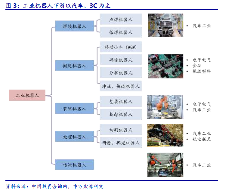 工业机器人应用广泛,下游以汽车和3C 为主。工业机器人根据用途可分为焊接机器人、搬运机器人、装配机器人、处理机器人及喷绘机器人等,广泛应用于汽车、3C 制造领域。其中,焊接机器人、喷涂机器人、处理机器人等主要应用于汽车工业;搬运机器人、装配机器人等主要用于电子3C。当前,中国制造业正迎来高端制造的关键转型,工业机器人作为工业互联网的核心硬件,发展前景广阔。