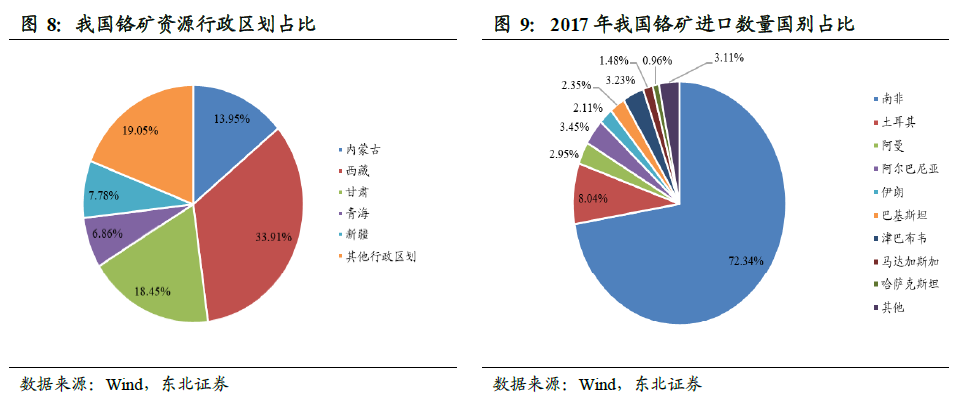 南非铬矿占我国进口70%以上。我国铬矿资源匮乏,截至2013年底,我国共有铬矿区63个,查明资源储量1142万吨,其中储量107.6万吨,基础储量401.5万吨,资源量740.5万吨,铬矿储量仅占世界探明储量的0.02%。我国有14 个省、自治区有铬铁矿资源分布,主要集中于西藏、甘肃、内蒙古、新疆、青海,分别占2013年总查明铬矿储量的33.91%,18.45%,13.95%,7.78%和 6.86%,超过80%。铬矿资源主要集中于西部边远地区,经济发展欠发达,交通不便,加之矿体的不规则形态和零散分布,矿产开发难度大。所以,我国铬矿资源很大程度以来进口,南非、土耳其和津巴布韦是我国铬矿的主要进口国,分别占2017年我国铬矿进口数量的72.34%,8.04%和3.23%。