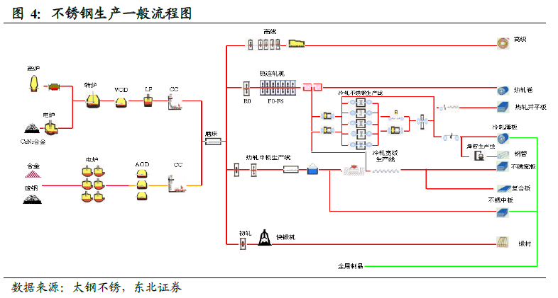 不锈钢冶炼工艺流程与比较:二步法占产能70%以上,三步法适用专业化生产。据2014 年史彩霞、吴燕萍、李冬刚和高忠江编写的《不锈钢冶炼工艺流程的分析与比较》一文介绍:目前世界上生产不锈钢的冶炼工艺主要分为一步法、二步法和三步法,其中EAF+AOD(电弧炉+氩氧精炼炉)的两步法工艺约占70%,三步法工艺约占20%。随着低磷铁水被广泛应用于不锈钢生产,新型一步法不锈钢冶炼工艺也被越来越多的不锈钢生产企业采用。
