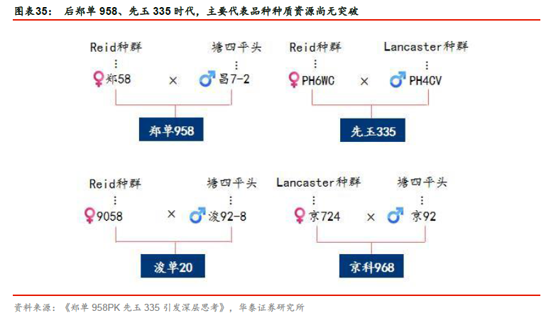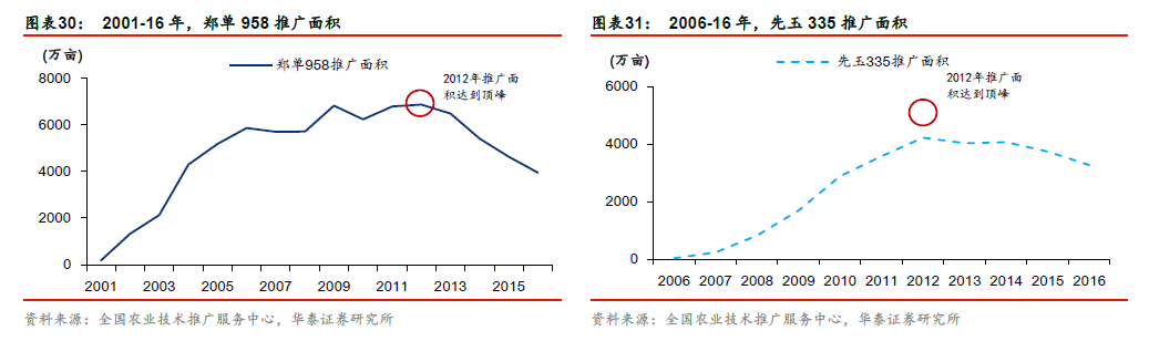 玉米:两大单品后时代,第七代品种渐行渐近。郑单958 和先玉335 的选育和推广在中国玉米育种史上意义重大,1)郑单958 株型紧凑,开创我国玉米密植(高密度育种是抗逆育种的第一个突破口)时代,以黄淮海地区夏播玉米为例,郑单958 亩均种植密度达到了4500 株,而同期黄淮海另一大品种浚单20 亩均种植密度则不能超过4000 株;2)先玉335 则开创“单粒播种”先河,凭借强力的产品表现,先后于04 年和06 年通过夏播区和春播区的国家审定,在实现种子论“粒”售卖的同时,亩均用种量大幅下降,从3~4 公斤降至1.5 公斤左右,种植管理效率大幅提升。