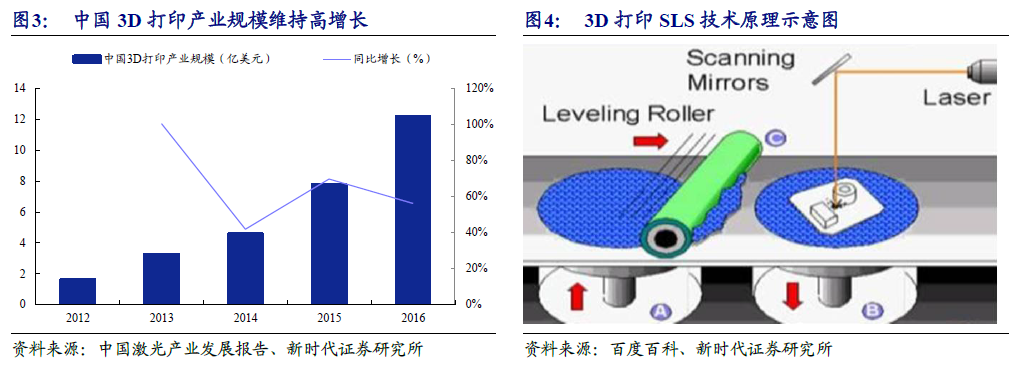 激光技术发展将加速3D 打印产业化和应用空间。激光技术与自动化控制技术结合而成的3D 打印(SLA、SLS)是一种全新的制造技术,尤其应用在零部件结构高度复杂领域,例如航空发动机、汽车发动机等的制造。根据中国激光产业发展报告,中国3D 打印主要应用在家电、消费电子和汽车等行业,2016 年中国3D 打印产业规模达到12.15 亿美元、增长56%,2012-2016 年复合增速65.7%。