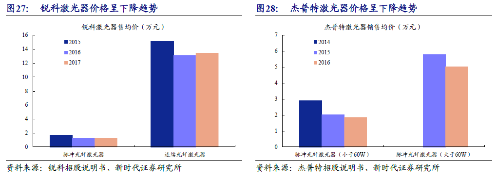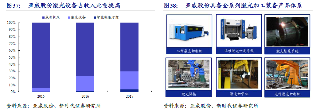 激光技术仍在不断提升,应用深度和广度仍将扩展。2017 年全球激光器应用于材料加工和通讯领域、分别占42%和34%;从应用形式来看,切割占35%、焊接占16%、打标占15%。当前光纤激光器已逐步取代二氧化碳激光器成为绝对主流,但半导体激光器以其结构紧凑、光束质量好、寿命长及性能稳定等优势受到产业青睐,例如应用于材料表面处理、熔覆等。半导体激光器或将是未来技术发展的主流,推动激光应用的深度和广度。