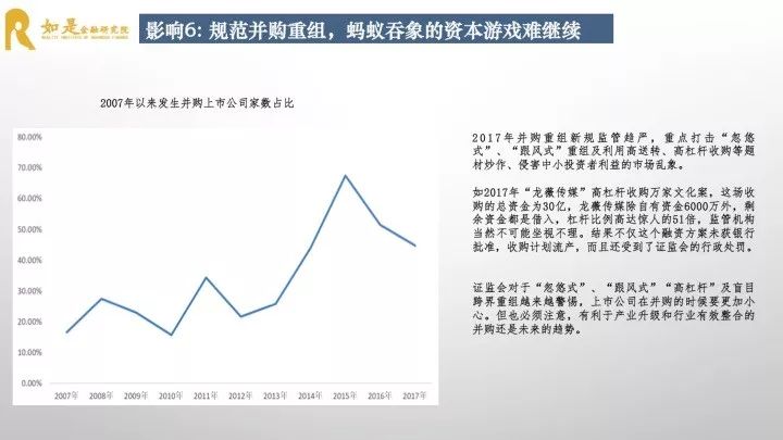 第六,并购重组趋严,蚂蚁吞象的资本游戏不好玩了。证监会总体上还是鼓励并购重组的,但也在加大力度规范。