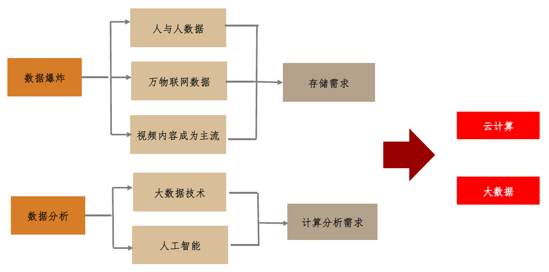 数据流量存储、分析需求带动云计算、大数据快速发展 相比于单个数据本身,海量数据背后孕育着巨大的价值,并由此带动对于数据存储、分析的需求提升。在此背景之下,云计算、大数据和人工智能作为实现数据存储和分析的有效方法,得到了快速的发展。