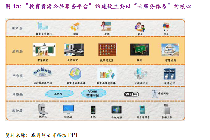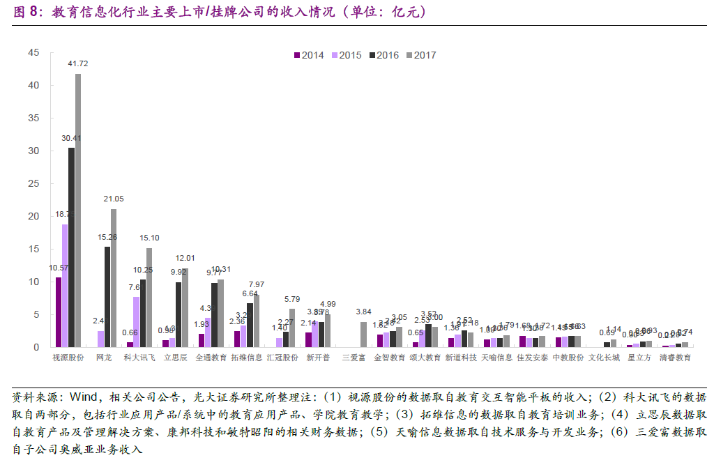 报告源起三之产业集群:主板、港股、新三板市场具备大量优质标的。在主板市场中,除了科大讯飞、视源股份、凤凰传媒、中南传媒、皖新传媒等公司依托于原有业务积淀布局教育信息化市场之外,全通教育、立思辰、拓维信息等上市公司均通过产业并购布局教育信息化行业;港股市场的网龙通过自身业务发展和外延并购拓展教育信息化版图;新三板市场涌现出新道科技、金宝威、金智教育、清睿教育等数十家优质的教育信息化公司,大部分公司拥有约2000~5000 万元净利润的体量。我们预计未来将更多的教育信息化公司挂牌新三板或者成为主板上市公司的并购对象。集硬件、软件、解决方案于一体、实现产品线的延伸成为目前教育信息化公司业务拓展的总体趋势。