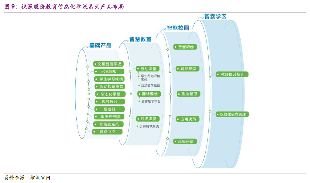 报告源起四之竞争优势:好产品和强渠道构建龙头企业坚固壁垒。教育信息化的产品已覆盖幼教、K12 及高教,其中K12 阶段的教育信息化产品以提升教学效果为主要目标,关注应试场景;高教信息化涉及到高等学校教学、管理的各个方面,及信息系统建设和资源共享平台建设为主;而幼教信息化针对的应用场景相对简单,目前多集中于展示互动,由于教育机构的信息化实施水平有限,企业需要根据客户需求提供整体解决方案,可靠、易集成的好产品成为企业竞争优势的重要组成部分。此外由于K12 教育信息化市场份额占据教育信息化市场的76%,为教育信息化行业的最重要细分市场,而K12 教育信息化行业渠道依赖性强,是典型的强资源型行业,渠道网络布局能力成为公司的核心竞争力之一。