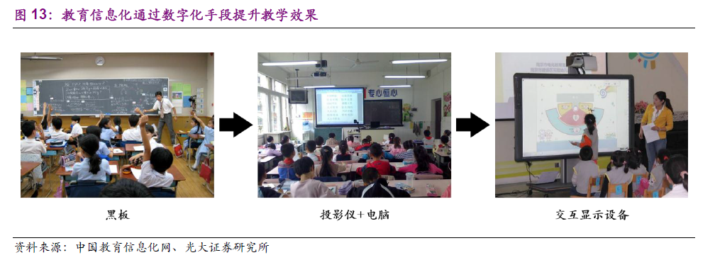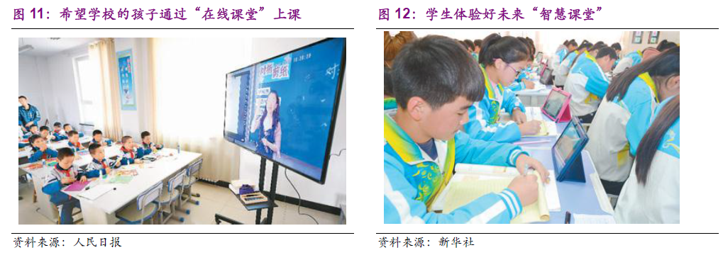 报告源起二之市场空间:教育信息化行业政策红利持续,科学技术的发展、教育制度的完善带来源源不断的信息化建设需求,具备海量市场空间。2010 年起,国务院、教育部每年都会发布政策支持教育信息化行业发展。此外,AI、大数据等热点技术不断提升“互联网+教育”应用场景的用户体验。2018 年全国广泛推进新高考改革,完善人才培养考核机制,也带动了“班牌”等硬件设备、“走班排课系统”等软件系统的信息化建设需求。