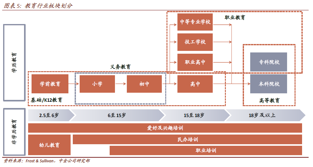民营资本在教育行业中的现状如何?2017 年,中国教育行业总收入达到41942 亿元,在过去10 年的年化增速达到13.2%。若考虑课外辅导(2016 年~3400 亿元)和职业培训市场(2015 年~3500 亿元,仅考虑5 个主要细分行业),则体量将进一步增加。