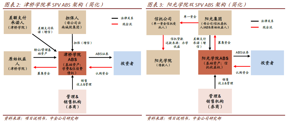 民办学校现金流可预测性强、稳定性高,是ABS 的优质资产。当前,在国内已有以学费和住宿费收费权为基础资产的证券化产品。如2015 年11 月,昆明理工大学津桥学院(民办非企业法人)成功发行以学费及住宿费债券为基础资产的ABS,为全国首例。2016 年,阳光学院亦发行了以其母公司阳光集团对其信托贷款的信托收益权为基础资产的ABS(双SPV 架构)。以信托收益权作为基础资产,无疑在法律界定上更为明晰。后发行的阳光学院ABS 采用了双重SPV 架构(交易成本更高),或许隐含对学费、住宿费债权法律界定明确性的担忧。而民促法修法后,这一问题将得到解决。