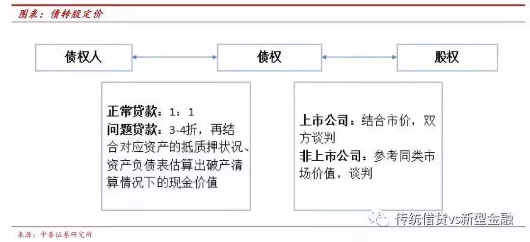 债转股定价主要涉及债权和股权定价:债权定价—正常贷款按照 1:1 债股比例定价;问题贷款一般以在3-4 折折扣率进行折价,再结合对应资产的抵质押状况、资产负债表估算出破产清算情况下的现金价值(由专业第三方机构负责评估)。武钢和云锡都是正常贷款,建行主导的基金以 1:1 的企业账面价值承接债务;股权定价—A、上市公司可结合市价,形成合理的估值区间后,双方进行谈判确定交易价格。9 月末,宝钢与武钢公布合并方案:武钢股份的现金选择权为 2.58 元/股;武钢股份停牌价为 3.17 元/股,市净率为 1.1倍;转股价就在 3 元左右的这个区间范围内。云锡上市公司(锡业股份、贵研铂业)的股权参照二级市场价格做安排。B、非上市公司也可参考同类市场价值,通过不同的估值方法互相验证,形成合理的估值区间后,双方进行谈判确定交易价格。C、这两单的价格都是双方协商谈判达到的价格,政府未参与。