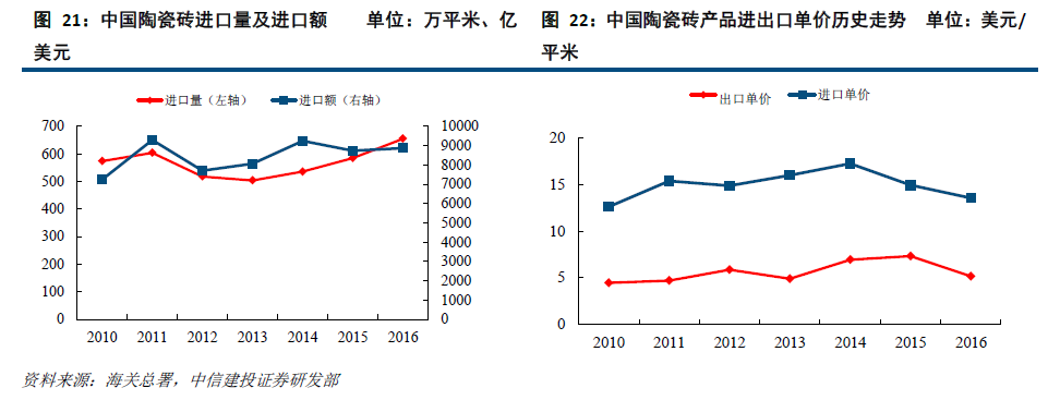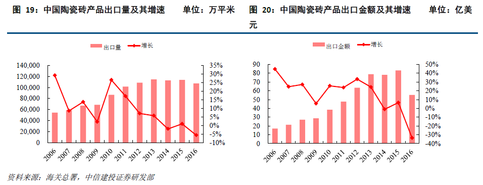 建陶市场规模庞大,增速趋缓,单价呈上升趋势。2017年,我国瓷砖产量101.5亿平,同比下降1.15%;全国瓷砖消费量88.1亿平,同比增长4.01%。消费增速快于产量增速,出口出现下滑。回顾建陶市场发展,2000-2011年,我国陶瓷砖产量经历快速增长期,复合增长率达15.7%。2011-2017 年,我国陶瓷需求进入平稳增长期,陶瓷砖产量从87.1增长至101.5亿平方米,复合增长率仅为2.6%,其中出现了两次负增长,预计陶瓷砖未来需求将处于微增长的平台期:即陶瓷砖的绝对需求量仍会处在较高水平,但增幅会有所降低。同期,规模以上建筑陶瓷收入与建筑装饰工程总产值增长也相应放缓,五年复合增长率分别7%与9%,好于产销面积的增幅,意味着随着消费升级,瓷砖单价上涨。