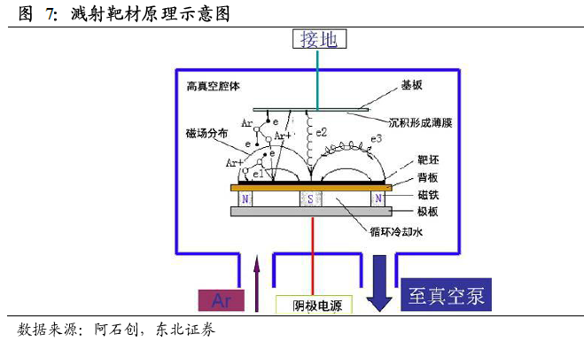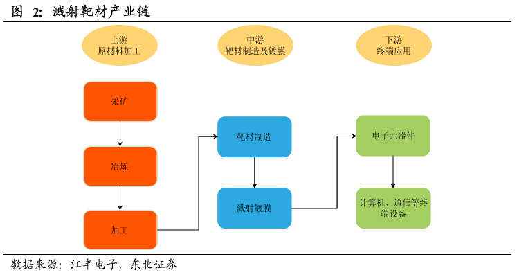 靶材产业链:中游制造日益关键。溅射靶材产业链包括金属提纯、靶材制造、溅射镀膜和终端应用环节。其中,靶材制造和溅射镀膜是关键环节。金属提纯位于靶材产业链上游,还可以细分为采矿、冶炼和加工。靶材产业链下游是电子元器件应用,包括计算机、通信和其他电子设备终端。
