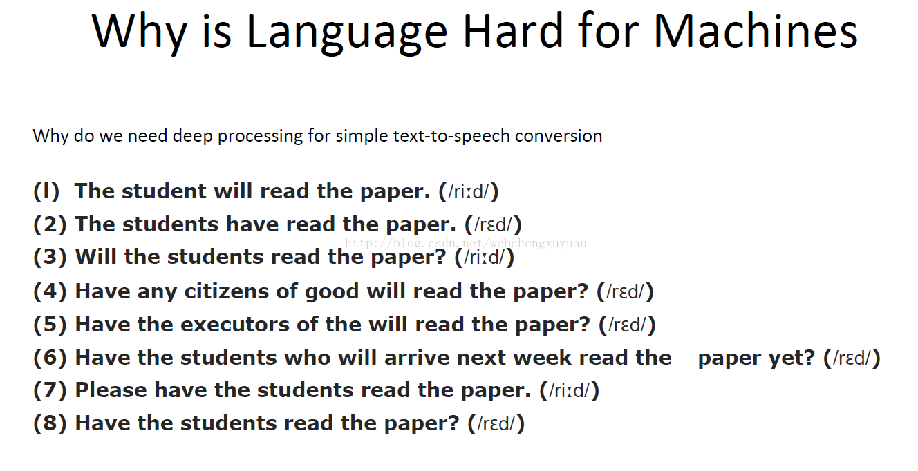 为什么机器理解人类语言是困难的?徐老师以read的读音和为例说明不仅机器分析read在不同句子中的准确发音是困难的,其实人分析出来也有一定的挑战。例子如下图: