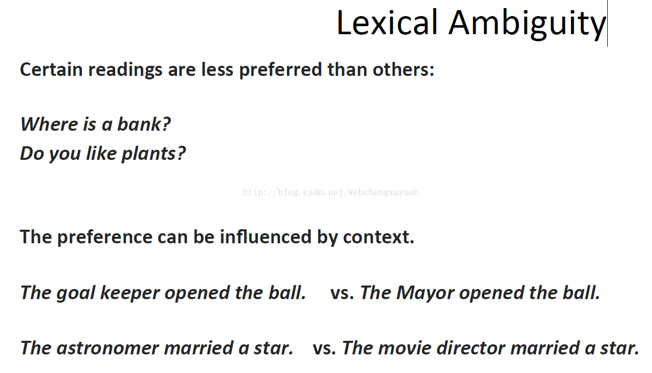 词的多义性,需要根据语言环境的上下文、情景进行推断。比如Where is a bank? Bank是指银行还是河岸?如果你要取钱后存款,bank自然指的是银行。如果你在河中划船,很累了,那就一定指的是河岸。下图有几个关于一次词多义的例子,你可以挑战一下自己看看能不能分析相同的词在不同的句子中分别指什么意思。