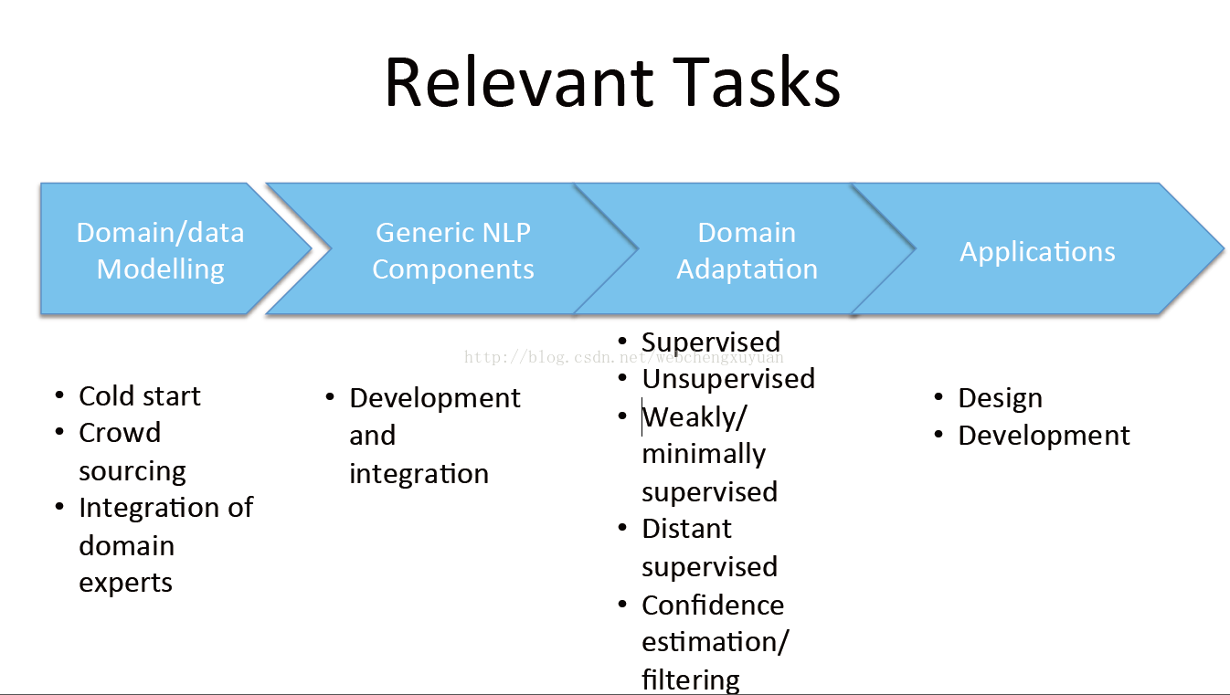 首先要做和领域专家沟通确定领域模型,然后选择通用的NLP开源工具。因为选择的NLP开源工具可能是针对新闻的,你要做针对医学的,所以要根据你的任务做领域适配的工作。领域适配部分要选择不同的机器学习方法,有监督的,无监督的。要做一个打分机制,来保证最后的准确率。因为分析过程是一步一步逼近的,不能用直接的YES 0R NO.最后做应用的时候要以用户为中心,设计一款好用的产品。详细流程见下图: