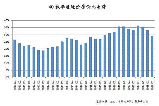 此后土地市场开始逐渐降温,截至2018年二季度,地价房价比已经连续下行三个季度。