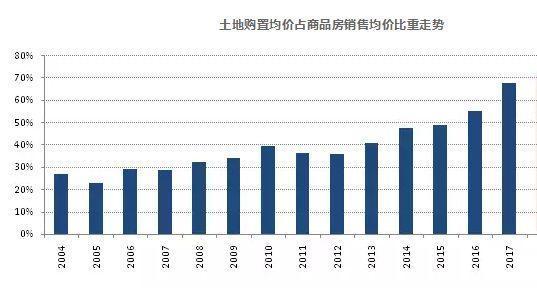 如果看2004年以来(土地招拍挂)长线走势,大概可知:这一比值的合理区间是30-35%,而2017年已经偏离合理值一倍左右!