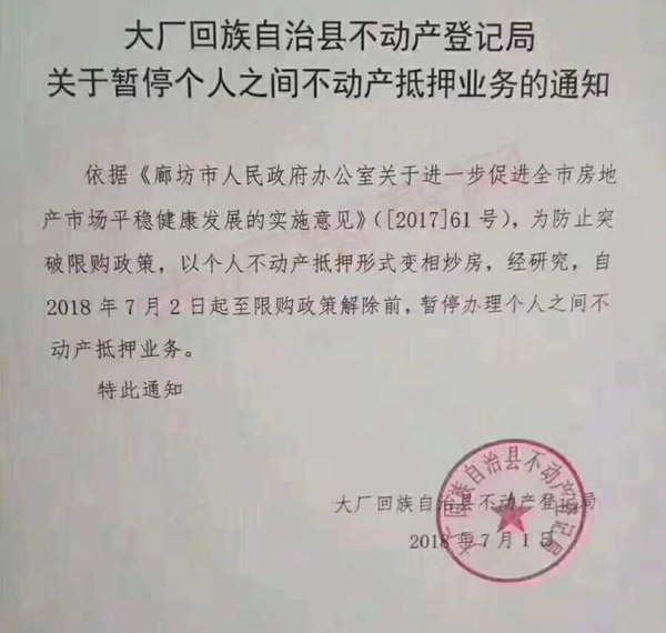 作为环京地区备受瞩目的河北“三县”之一,昨日大厂传出消息称,自7月2日起至限购政策解除前,暂停办理个人之间不动产抵押业务,以防止变相炒房。