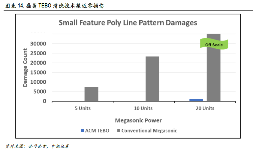 时序能激气泡震荡兆声波清洗(TEBO)。存储芯片从2D 升级到48 层3D 使芯片的高深宽比逐渐提高,逻辑芯片进入finFET 结构,有效的清洁需要使用较高功率级别的兆声波,这样会使原本脆弱的晶圆片造成严重图案损伤。而TEBO 技术可以稳定气泡的震荡,达到低甚至零损伤。