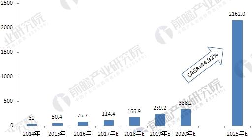 据前瞻产业研究院权威发布的《车联网行业市场前瞻与投资战略规划分析报告》统计,我国车联网市场规模在2016年达到76.7亿美元,据测算,2017年车联网市场规模约114.4亿美元。据相关调查测算,我国车联网市场规模有望在2025年达到2162亿美元,占全球市场的1/4,5年平均复合增长率将达到44.92%。