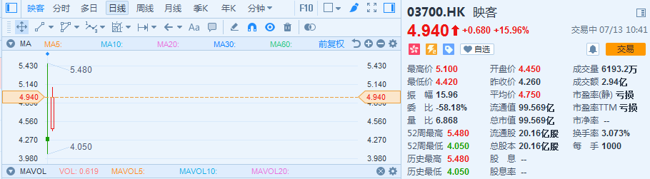 映客连续第二个交易日大涨此外,昨日在港股上市的映客今天继续大涨,截至发稿时已上涨近16%至4.94港元,总市值接近100亿港元。