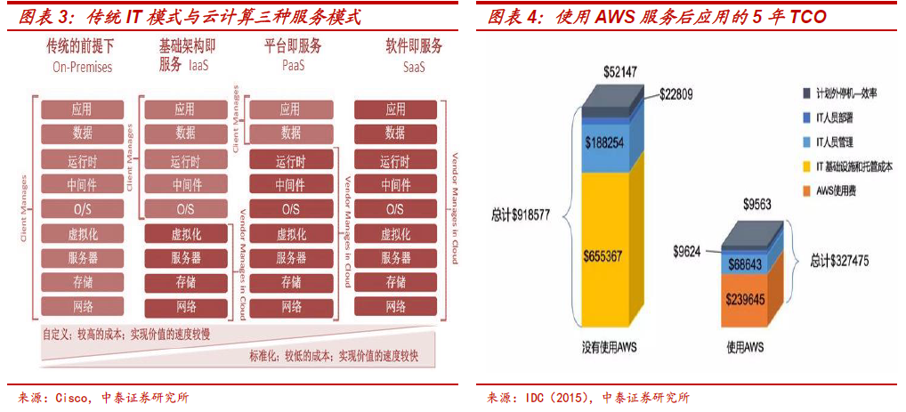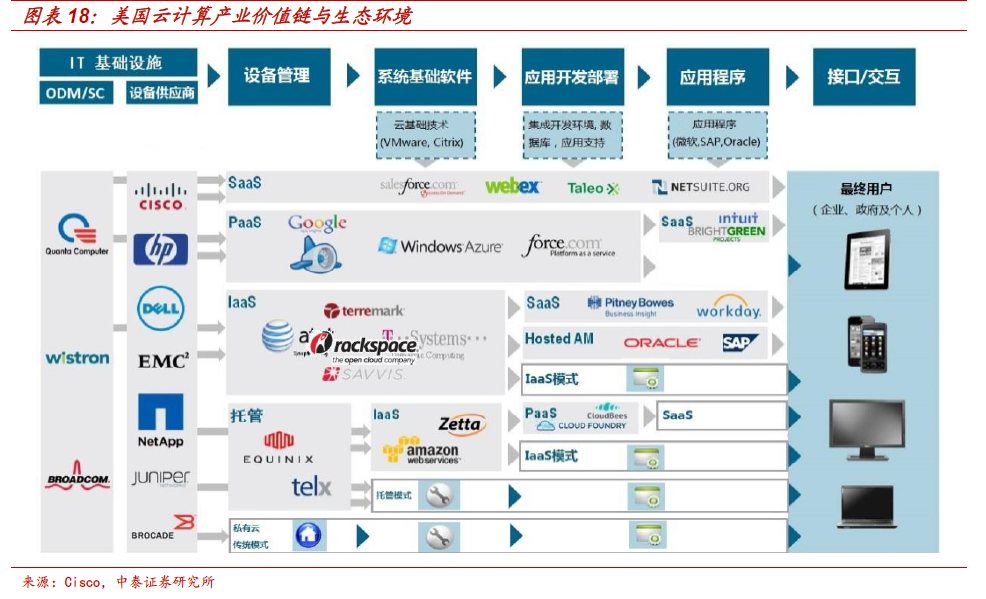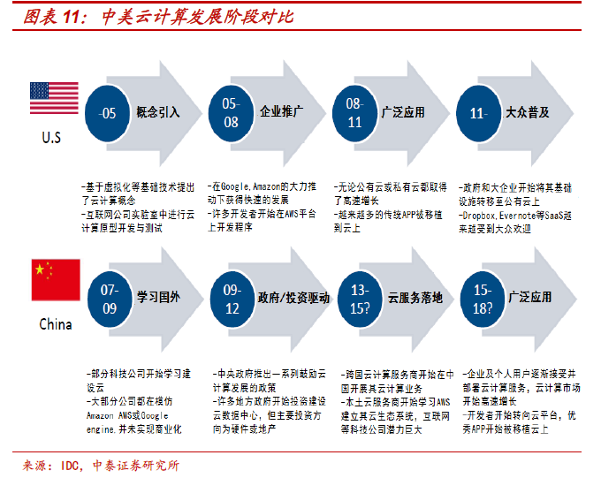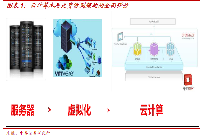 从云计算技术发展历程看,经历了物理机、虚拟化、公有云三阶段。物理机阶段,企业和个人购买PC计算机或服务器,需要考虑购买CPU、内存、硬盘硬件配置的大小,缺乏时间和空间的灵活性,比如对采购时间和配置大小没有办法灵活调整。为了解决这个问题,虚拟化技术应运而生,以虚拟化技术起家的公司VMware成立于1998年,可以实现从物理设备服务器或者数据中心的CPU、内存、硬盘中虚拟出一部分给客户, 虚拟化软件业务实现快速增长。随着数据中心规模越来越大,技术演进,发明了算法(Scheduler)来进行成千上万台服务器资源池的调度,根据用户需求快速自动完成资源池的配置,后期虚拟化开源技术KVM、XEN日趋成熟,VMware霸主地位受到撼动。目前主流是四种虚拟化技术分别是VMware的ESX、微软的Hyper-V、开源的XEN和KVM。
