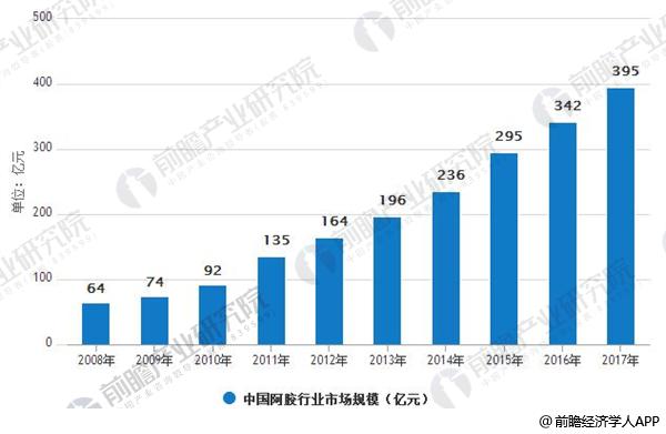目前我国阿胶行业有100多家生产企业,除了东阿阿胶、福胶销售量较大外,其他阿胶小厂普遍产量在100-200 吨之间,全国销量在6000-7000 吨上下。根据前瞻产业研究院发布的《阿胶行业市场需求与投资规划分析报告》数据统计,2015年我国阿胶行业的销量为5219吨。随着人们生活水平的提高,对健康对养生越来越重视,而且近几年阿胶行业对宣传的投入逐步增加,更多的人知道了阿胶的滋补功效。阿胶市场规模从2008年的64亿元到2016年的342亿元,复合年均增长率为23.3%。