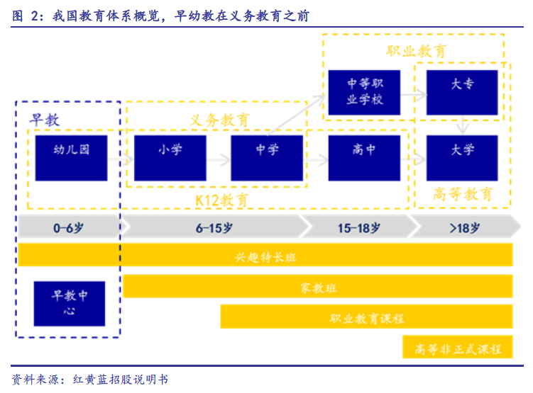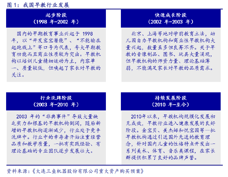 政策端驱动我国民办教育市场发展。近年来我国出台了一系列支持和鼓励民办教育的法案,包括《民办教育促进法》、《国务院关于鼓励社会力量兴办教育促进民办教育健康发展的若干意见》等。面对公办教育体系资源不足、公办学校入学困难等问题,民办教育的市场潜力巨大。另外,相关部门亦出台了一系列支持教育培训行业的法案,如《国家中长期人才发展规划纲要(2010-2020 年》、《国家中长期教育改革和发展规划纲要(2010-2020 年)》等。作为民办教育体系中重要的一环,早教培训行业是充满前景的朝阳产业,在政策利好的条件下,早教市场规模具有很大的增长空间。