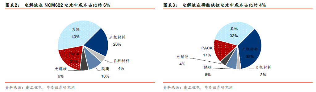 电解液在锂电池成本中占比低,但是对性能影响重大。锂电池成本构成中,原材料占比80%左右,原材料主要包括正极、负极、隔膜、电解液,其中电解液在电池系统中的成本占比为4%-6%。电解液在正负极中间起到传导锂离子的作用,其性能直接关系到锂电池的高电压特性、充放电倍率、循环寿命、安全性等。