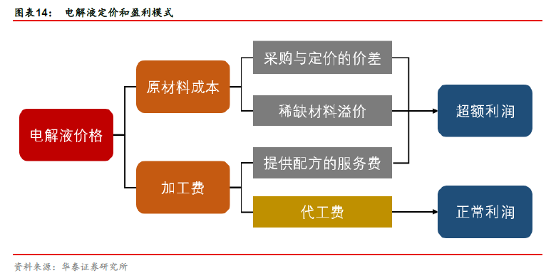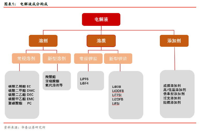 溶质六氟磷酸锂成本在电解液成本中占比高。根据电解液厂商珠海赛纬招股说明书,电解液成本中原材料占比超过90%,人工和制造费用等其他约占比10%。原材料中,由于每个配方所需的添加剂种类和用量的不同,各材料成本占比不同。其中溶质六氟磷酸锂是成本占比最高的,由于价格波动,其占比变化较大,最高可达70%以上。根据新宙邦6 月21 日的投资者交流纪要,新宙邦电解液原材料成本构成中,锂盐成本占比在30% ~ 50%之间,溶剂占比20% ~ 30%之间,添加剂成本占比10% ~ 30%之间。我们按照本周市场均价测算各原材料的成本占比,与新宙邦公告的数据基本吻合。
