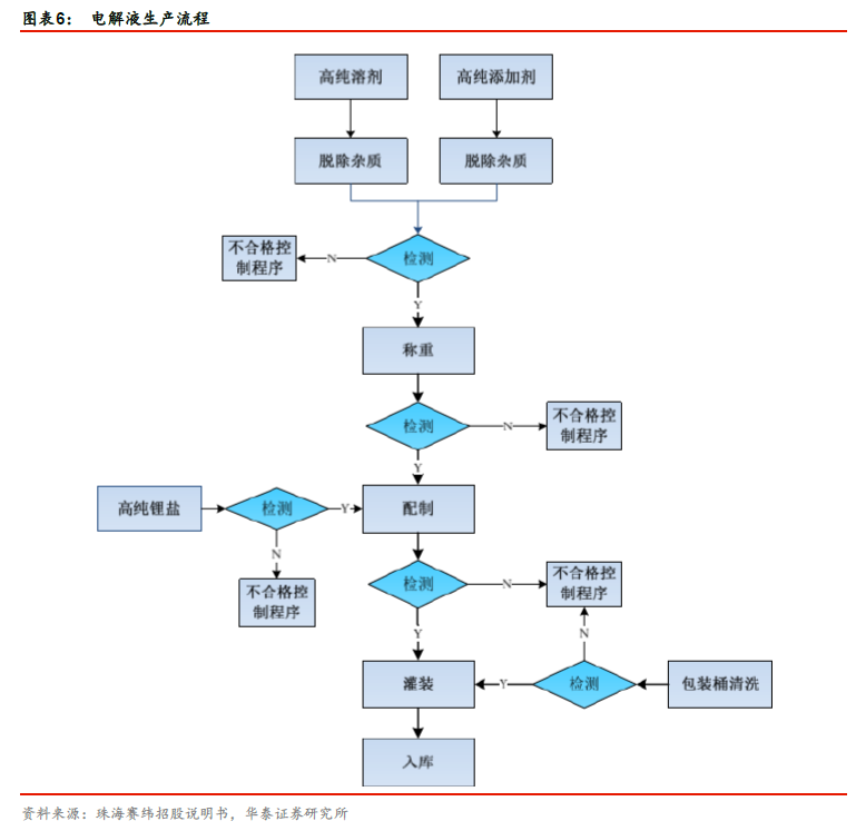 电解液的工艺控制是保证品质的关键。电解液属于精细化工品行业,精细化学品的核心技术主要包括产品配方、工程设计、生产中的反应机理和过程控制,这些关键技术均需要多年的研究开发和工艺经验的积累才能有效运用,从而生产出具备稳定质量的产品。电解液的生产工序主要分为:溶剂提纯、添加剂提纯、电解液配置以及灌装四大步骤,每个步骤都需要精细化检测,以保证产品的品质。
