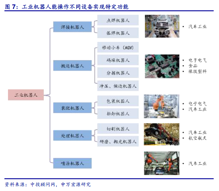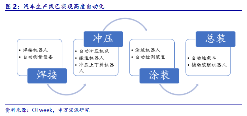 高度自动化:汽车、半导体生产自动化程度高,由不同自动化的工艺流程组成。以汽车工业为例,汽车的生产主要包括冲压、焊接、涂装及总装四大部分流程。当前,汽车生产线已基本实现全自动化生产,工业控制设备及以焊接机器人、喷涂机器人、处理机器人为代表的自动执行设备被广泛应用于汽车生产线各工艺流程,代替人力操作实现高效自动化生产。