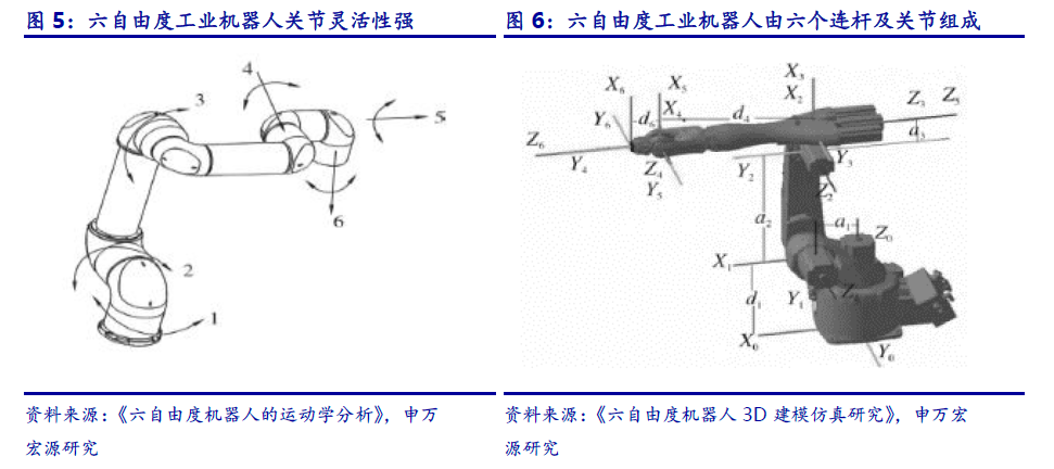 六轴工业机器人可以实现多自由度的运动,模拟人类实现物体转动与位移。机器人的自由度由其可沿轴的直线移动、摆动或旋转动作的数目表示,自由度越多就越接近人手的动作机能,通用性就越好。目前在工业领域中以六轴机器人应用最为广泛。六轴机器人与人类手臂极为相似,它可以拿起一个对象,并移动将其放置在空间特定位置,同时还可以任意改变对象位姿状态,进行偏航、俯仰和横滚操作。