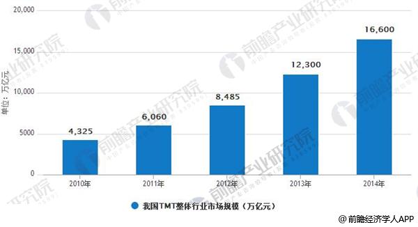 据前瞻产业研究院发布的《通信产业发展前景预测与投资战略规划分析报告》显示,2014年我国TMT整体行业市场规模达到了16600万亿,同比2013年的12300亿元增长了34.96%