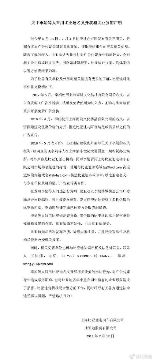 NBD:比亚迪在声明中称,李娟冒用比亚迪高管身份开展业务,涉嫌伪造公司印章罪及合同诈骗罪,此前,你有注意到李娟与比亚迪相关联系吗?