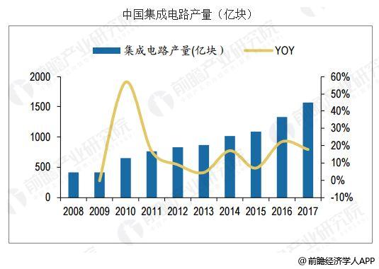 据前瞻产业研究院《集成电路行业市场需求预测与投资战略规划分析报告》数据显示,2017年,中国集成电路市场延续增长态势,产量达到1565亿块,同比增长18%,2008-2017年年均复合增长率CAGR达16%。我国集成电路自给率仍较低,很大比例的需求仍要依靠进口满足。2017年我国集成电路进口量近3770亿块,同比增长10%,约为同年我国集成电路产量的2.4倍,由此可见自给率仍低。目前我国集成电路行业的主要矛盾主要是高速增长的需求与自身供给能力不足的矛盾。