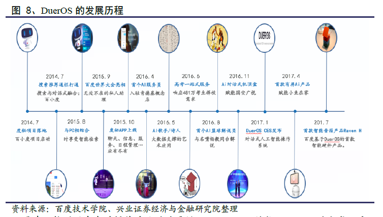 接下来,我们从产品和盈利的角度来看待公司的AI业务。人工智能应该是依托于产品的基础,本身单独是不能成为一个变现模式的。从硬件上看,目前手机与PC占据了流量的入口;在未来硬件不断智能化的发展趋势下,公司基于看好汽车和家庭有望成为继手机后的重要流量入口,选择在此领域布局。考虑到下一代的互动方式将从以“触摸”变成以“语音”为基础,做语音操作系统是公司在AI领域布局的前端产品之一:即DuerOS,对话式人工智能操作系统。而公司在AI领域布局的前端产品之二:汽车端自动驾驶开放平台Apollo。