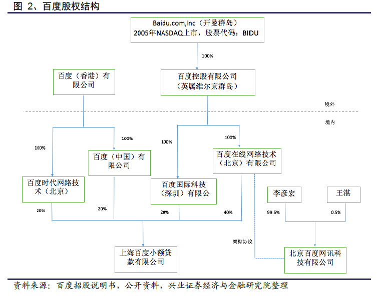 实际控制人为李彦宏 。百度公司的实际控制人及董事局主席均为李彦宏。百度在中国境内有两家重要的子公司:“百度在线网络技术 (北京)有限公司”和李彦宏与王湛共同持股的“北京百度网讯科技有限公司”。前者作为一家完全外资持股的公司,在境内开展相关业务受限,而后者作为一家已取得相关牌照的内资公司,为了使得公司在中国境内从亊业务更加合法合规,二者通过协议控制的方式,由北京百度网汛科技有限公司经营大部分业务。李彦宏持有北京百度网汛科技有限公司99.5%的股权,具有实际控制权。李彦宏拥有百度公司16.10%的股权,为第一大股东。
