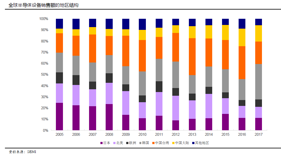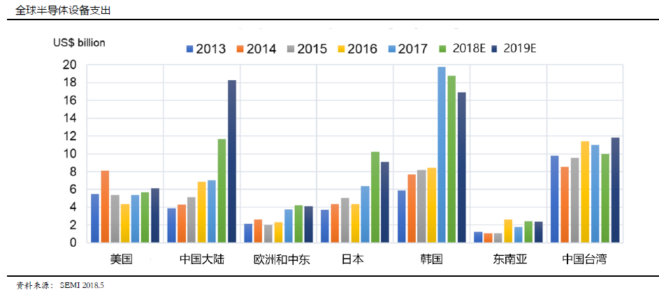 2018年大陆成为世界第二大半导体设备需求市场。根据SEMI数据,全球半导体设备支出连续第三年创纪录,预计2018年同比增长14%,2019年增长9%。韩国和中国在增长方面处于领先地位,三星在全球支出方面占据主导地位,中国市场迅速崛起。