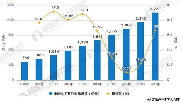 据前瞻产业研究院发布的《电子政务发展前景与投资战略规划分析报告》数据显示,在国家的大力支持和推动下,2017年电子政务取得了较大进展,增速再创新高。2017年我国电子政务市场规模达到2722亿元,同比增长16.2%。2013-2017年电子政务市场规模年均复合增长率达到14%,预计未来5年内,电子政务仍将保持13%左右的稳定增长。预测2018年电子政务市场规模将突破3000亿元。