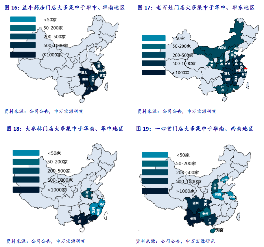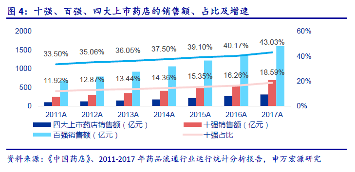 国内药店连锁化率不断提升,17 年连锁药店数量首次超过单体药店,药店龙头陆续上市,资金优势明显。2017 年我国共有约45.4 万家零售药店(同比增加6700 家),其中连锁药店数量为22.9 万家,连锁化率由2016 年的49.4%升至50.4%,连锁门店数量首次超过单体药店。观察我国药店连锁化率的情况,从2014 年左右开始,药店行业进入结构性调整阶段,单体药店的数量开始呈下降趋势,药店的连锁化率开始快速提升,药店发展从行业数量提升开始向集中度提升转型,我们认为这个与药店进入新一轮整合周期有关。